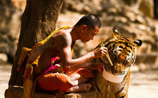 Chơi với hổ, Thái Lan: Tại đền Hổ ở ngoại ô Bangkok, du khách có thể tiếp cận với chúa sơn lâm ở khoảng cách gần. Khu vực này mở cửa đón khách từ năm 1994 và là nơi nuôi dưỡng khoảng 150 con hổ