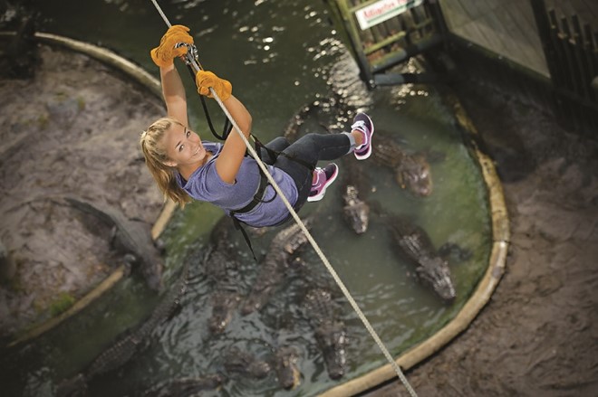 Zipline . Zipline tại khu du lịch teambuilding độc đáo ở Sở thú Trại cá sấu St. Augustine, Florida, Mỹ, cho du khách cơ hội ngắm nhìn các loại cá sấu từ trên cao. Tại đây, du khách sẽ được chiêm ngưỡng những con cá sấu Mỹ, châu Phi và Ấn Độ.. Ngoài ra ở đây còn hấp dẫn phượt thủ với vô vàn trò chơi teambuilding hấp dẫn.